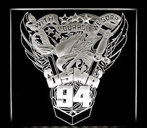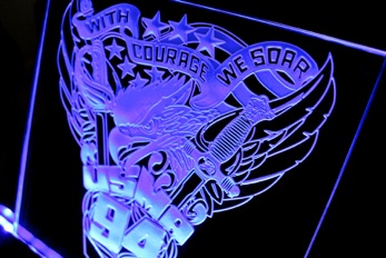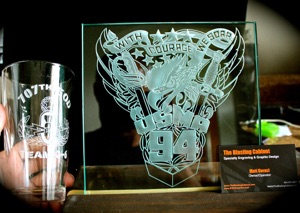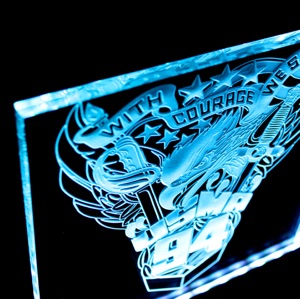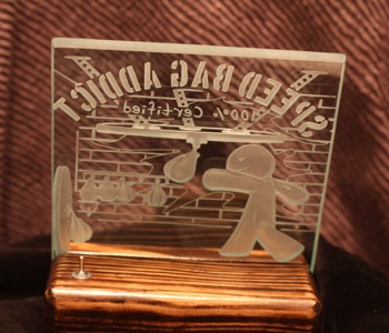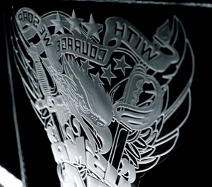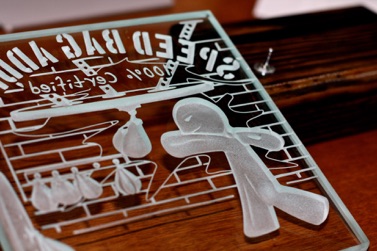 In honor of our 20th reunion I’ve made a special engraving of our class crest. The crest was hand drawn and hand engraved into 3/8” thick glass.